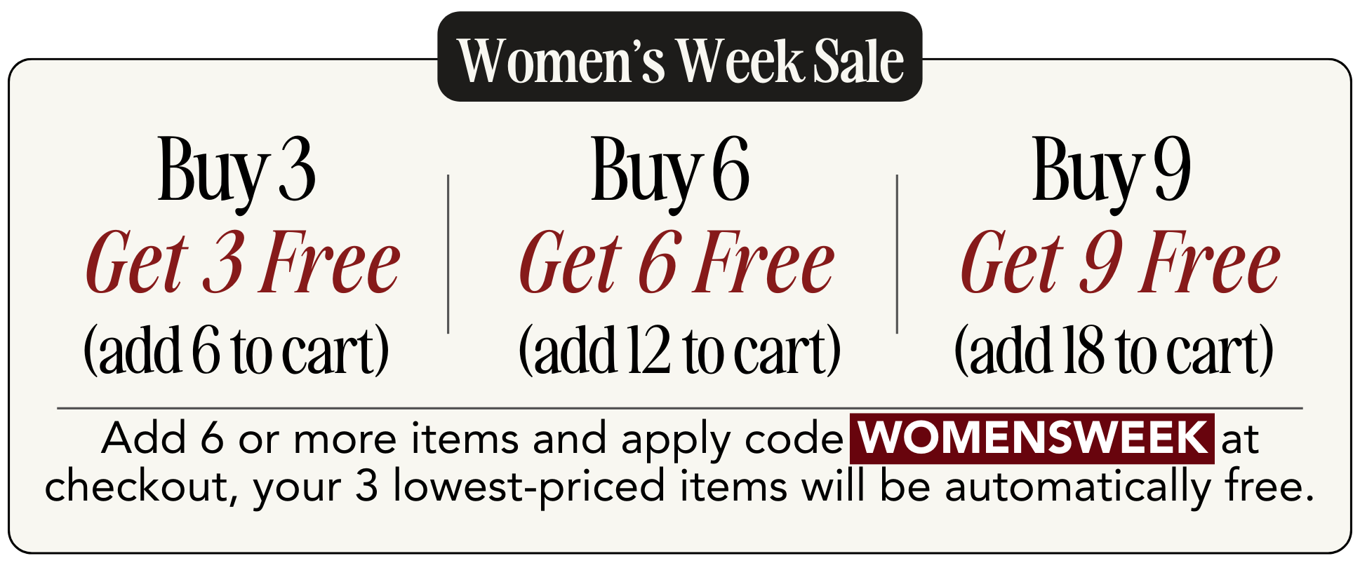 WOMEN'S WEEK SALE: Buy 3, Get 3 Free